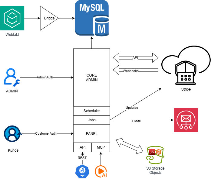 Wenn sie Interesse an dieser Lösung haben setzen sie sich bitte mit uns in Verbindung. Wir können nichts versprechen, und sie müssen mithelfen! Ein umfangreicher Teil der Aufwände bei der Umsetzung betrifft die Analyse der Daten die aus der WEBFAKT Firebird Datenbank gelesen werden. Hier gibt es Inkonsistenzen und Unklarheiten. Im Zuge der Analyse haben wir Services identifiziert die, durch Fehler in den Daten, nie oder falsch an Kunden abgerechnet wurden. Wir haben diese Fälle für unseren Kundenstamm bereinigt, gehen aber davon aus das wir das für ihre Daten nicht ohne weiteres leisten können. Interesse geweckt?